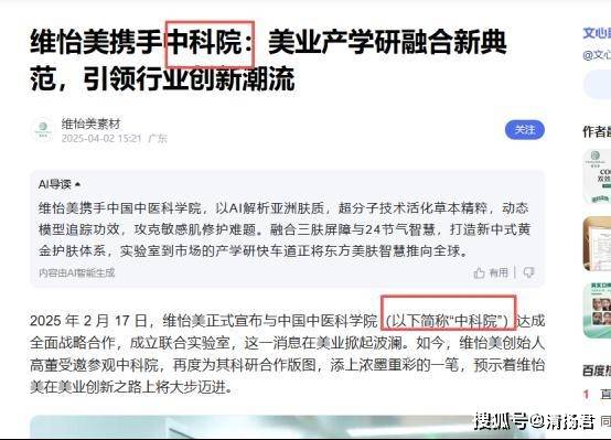 在多篇题为《维怡美携手中科院:美业产学研融合新典范,引领行业创新潮流》的文章中,包括名为“维怡美素材”的账号,宣称“维怡美正式宣布与中国中医科学院(以下简称‘中科院’)达成全面战略合作,并成立联合实验室”。文中还称,维怡美创始人高董受邀参观“中科院”,此举“为其科研合作版图添上浓墨重彩的一笔”,预示品牌将在美业创新领域加速前行。