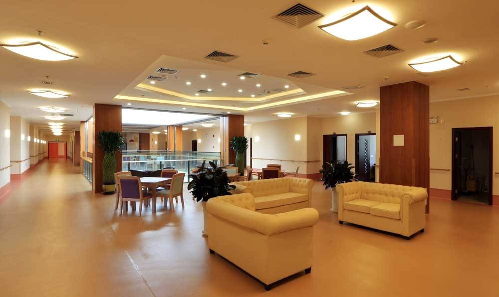 除了专业的医疗护理,公寓的设施建设也充分体现了“医养结合”与“以人为本”的理念。公寓总占地面积18000平米,建筑面积21000平方米,其中7000平方米的园林区域,绿植繁茂、空气清新,为老人提供了一个天然的养生环境,老人在自然中散步、休闲,有助于身心舒缓与健康恢复。主体建筑采用“回”字形设计,蕴含“天人合一”的传统理念,融合古典与现代建筑风格,环境赏心悦目,既保证了建筑的实用性,又营造了温馨舒适的居住氛围。