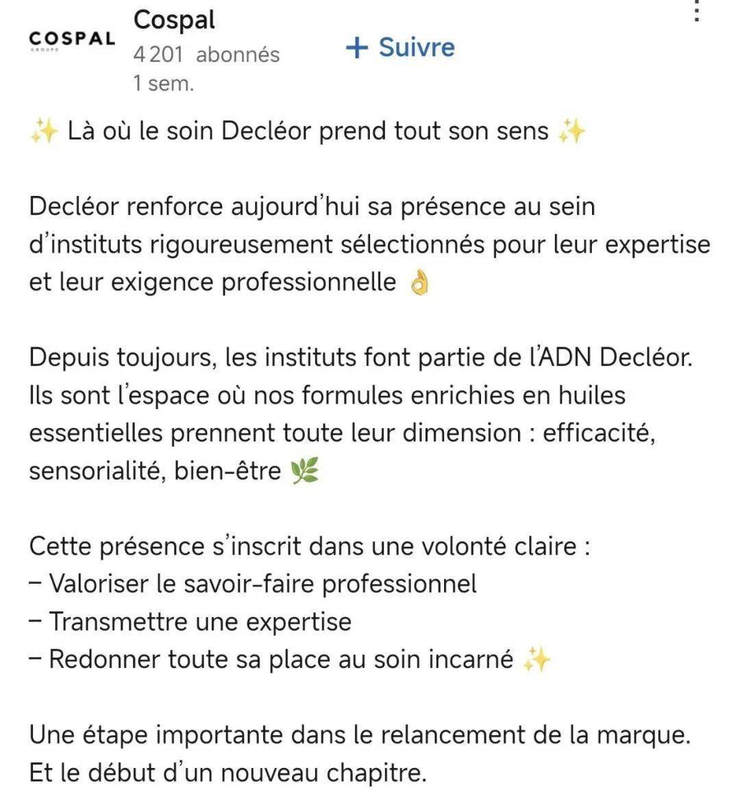 但这套增长逻辑的落地,高度依赖Cospal的渠道管理能力与供应链效率。专业机构的筛选与合作需要长期投入,而零售端的产品研发、市场推广也需要持续资源支持。若任何环节出现偏差,都可能导致“情怀故事”无法转化为实际营收,让Decléor的焕新沦为又一次资本游戏。